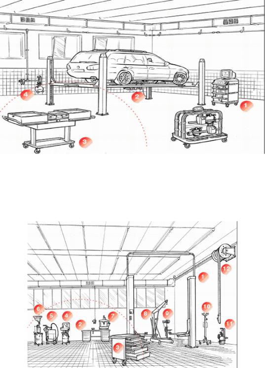 1 – подъемник; 2 – верстак с тисками; 3 – комплект ручного инструмента в тележке; 4 – мойка деталей передвижная; 5 – установка для заправки масла; 6 – универсальная установка для слива и отсоса масла; 7 – пресс гидравлический; 8