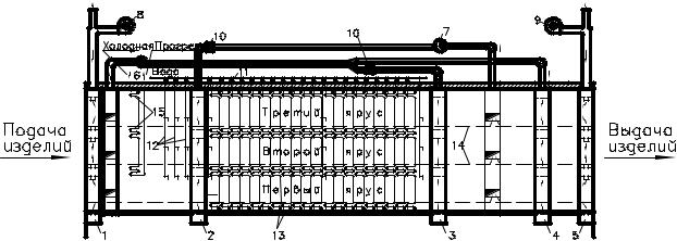 Узкая трехъярусная камера. В узкой камере (шириной 2,6 м, длиной 127,4 м) воздух, забираемый вентилятором из зоны подогрева, подается в три воздушные завесы: в торце, в начале и конце зоны изотермической выдержки. В зоне охлаждения изделия охлаждаются за счет отдачи тепла на покрытие тепловых потерь в окружающую среду, а также за счет нагрева воздуха, циркулирующего в щелях торцовых штор (рис. 2.8).