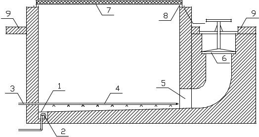 1 – трап; 2 – конденсатоотводящее устройство; 3 – паропровод; 4 – трубы с перфорациями; 5 – вентиляционное отверстие; 6 – вентиляционный клапан; 7 – крышка камеры; 8 – гидрозатвор; 9 – пол цеха