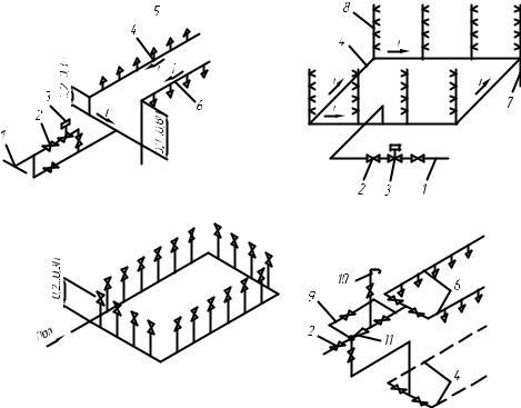 а с помощью сопел; б через вертикальные стояки; в с помощью насосов-кондиционеров; г с внешним эжектором; 1 магистральный паропровод; 2 запорный вентиль; 3 регулирующий клапан;