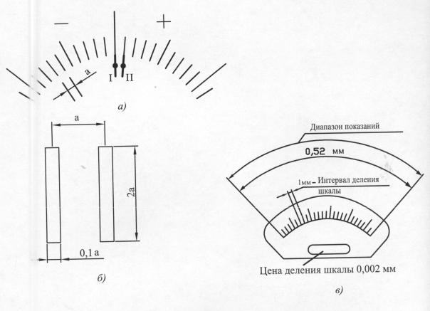 Цена деления шкалы – разность значений размера, соответствующая двум соседним отметкам шкалы; определяет наименьшее значение измеряемой величины, которое можно уверенно отсчитать по целым делениям шкалы. Например, если перемещение указателя шкалы из положения I в положение II (рис.11, а) соответствует изменению величины в 0,001 мм, то цена деления этой шкалы равна 0,001 мм. Значения цен делений выбирают из ряда 1, 2, 5, 10, 20, 50, 100, 200, 500 мкм. Но чаще всего используют кратные и дольные значения от 1 до 2, а именно: 0,01; 0,02; 0,1; 0,2; 1; 2; 10 мкм и т.д.