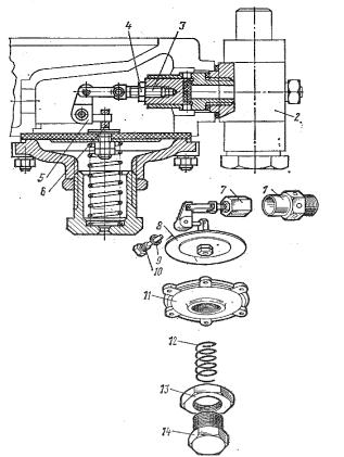 При разборке первой ступени (рис. 7.6) придерживаются такой последовательности. Ослабляют контргайку 13, вывёртывают болт 14 пружины высокого давления и вынимают пружину 12, отвёртывают гайку и снимают нижнюю крышку 11 редуктора. Разъединяют шток мембраны первой ступени с рычажком 5, снимают мембрану 8, вывёртывают ось 10 и вынимают рычажок вместе с клапаном 7, отвертывают две гайки, снимают фильтр 2 вместе с седлом 1 клапана.
