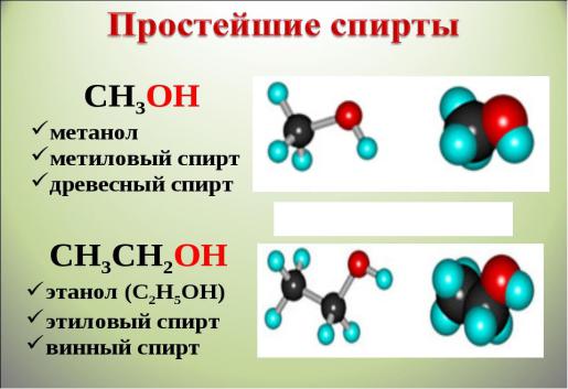 Этиловый и метиловый спирты токсичны и ядовиты, 30 г метилового спирта может вызвать смерть (метиловый спирт СН3ОН – древесный спирт). Этиловый спирт (С2Н5ОН) оказывает наркотическое воздействие.
