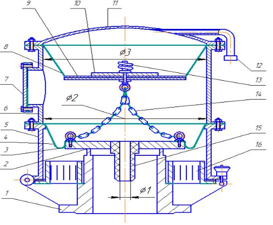 1 – соединительный патрубок; 2 – седло; 3 – тарелка; 4 – мембрана; 5 – нижняя часть корпуса; 6 – верхняя часть корпуса; 7 – боковой люк; 8 – верхняя мембрана; 9 – диски; 10 – регулировочные грузы;