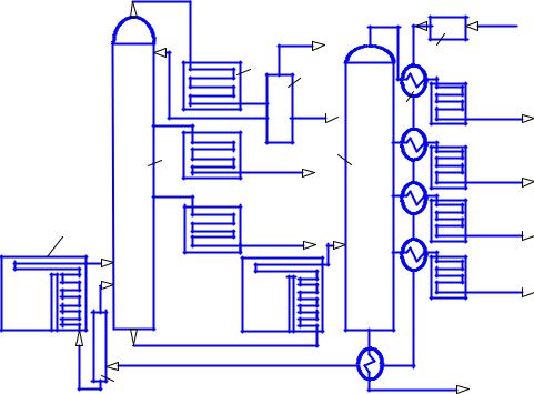 Рис. 2.1. Комплексная атмосферно-вакуумная установка переработки нефти: 1 – трубчатая печь; 2 и 5 – ректификационные колонны; 3 – холодильник; 4 – отделитель газа; 6 – теплообменник; 7 – насос;