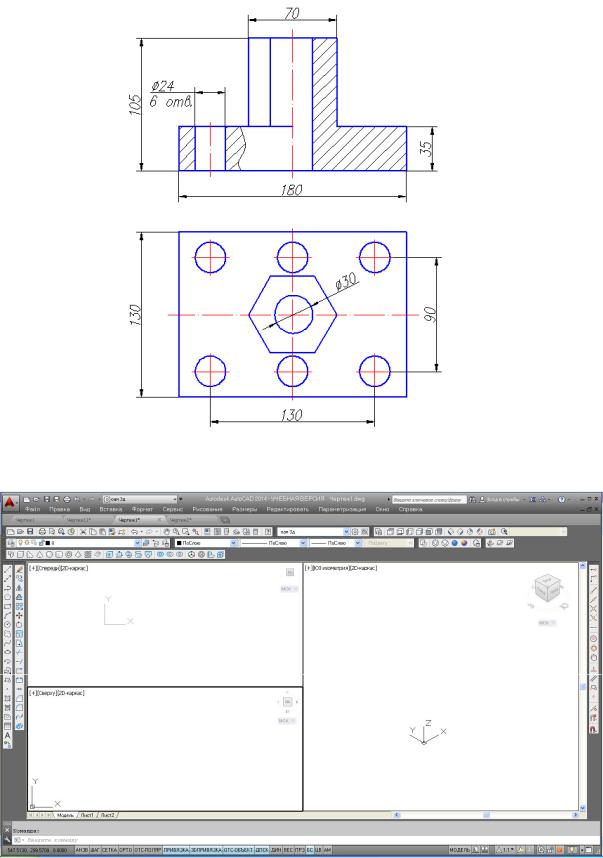 4.Активизировать нижний левый экран и вычертить в нем прямоугольник длиной 180 мм, шириной 130 мм и 6 окружностей диаметром 24 мм с помощью изученных ранее команд.