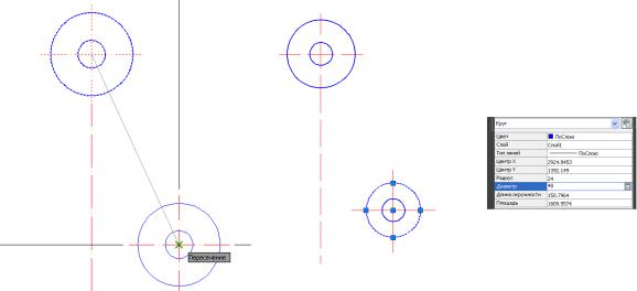 3.4. Выполнить осевые для окружностей с правой стороны чертежа с помощью команд Рисование → Прямая → Отступ: от вертикальной – на 64 мм,