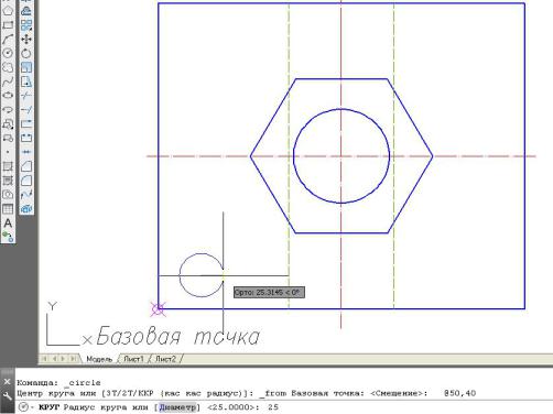 3.5.Выполнить крайнюю окружность радиусом 25 мм, как элемент будущего массива, с помощью команд Рисование → Круг → временная привязка