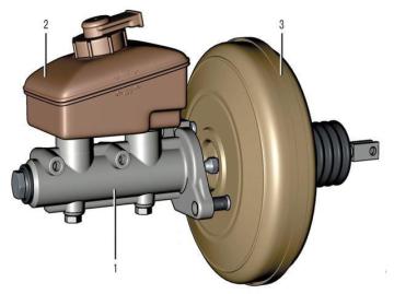 1 – главный тормозной цилиндр; 2 – емкость с тормозной жидкостью; 3 – корпус усилителя