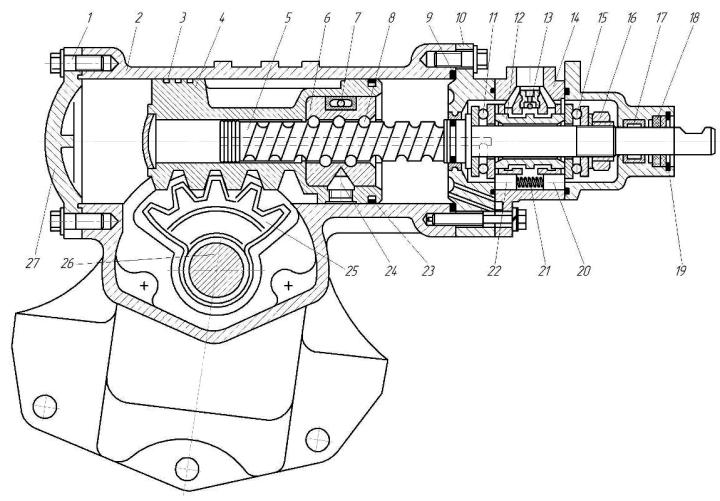 1 – болт; 2 – корпус силового цилиндра; 3 – уплотнительные кольца поршня; 4 – поршень-рейка; 5 – винт; 6 – шариковая гайка; 7 – соединительная трубка; 8 – шарик; 9, 23 – уплотнительные кольца; 10 – нижняя крышка распределителя; 11, 15 – упорные шариковые подшипники; 12 – золотник; 13 – шариковый клапан; 14 – корпус распределителя; 16 – регулировочная гайка; 17 – роликовый подшипник; 18 – манжеты; 19 – стопорное кольцо; 20, 22 – плунжеры; 21 – пружина; 24 – стопорный винт; 25 – зубчатый сектор; 26 – вал рулевой сошки; 27 – крышка силового цилиндра