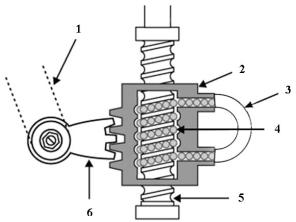 Рис. 3. Соединение винта и гайки: 1 – рулевая сошка; 2 – шариковая гайка; 3 – соединительная трубка; 4 – шарики;