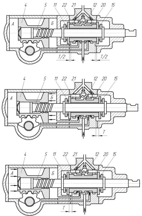 При повороте рулевого колеса вправо винт 5 (рис. 4, б) вывертывается из гайки поршня 4 и перемещается вправо вместе с золотником до упора большого кольца подшипника 11 в торец корпуса. Зазор между подшипником 15 и торцом корпуса станет максимальным (равным Т).