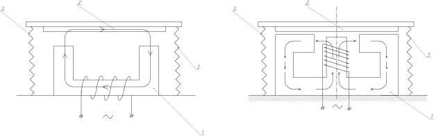 На рис. 24 схематично изображена конструкция электромагнитных вибровозбудителей с П-образным и Ш-образным магнитным сердечником.