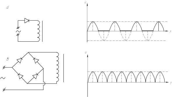 На рис. 25 изображены схемы питания постоянным током и графики выпрямленного напряжения U(t) при использовании однополупериодного выпрямителя (рис. 25, а) и двухполупериодного выпрямителя (рис. 25, б).
