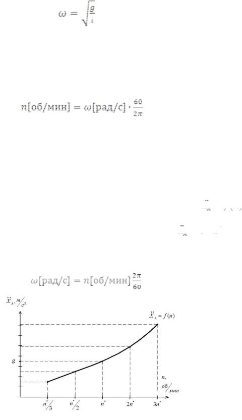 Рис. 39. Зависимость виброускорения от частоты вращения кривошипа