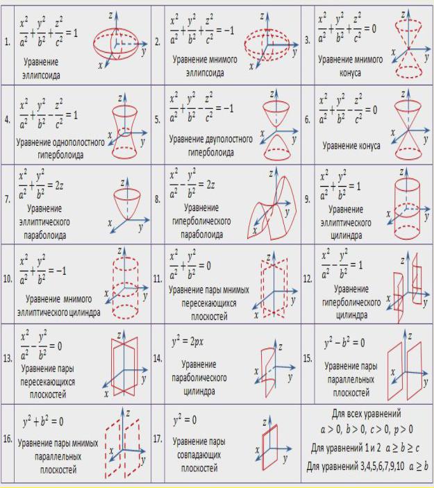 Существует семнадцать видов поверхностей второго порядка. Идея классификации поверхностей основана на приведении их уравнений к каноническому виду в результате преобразования системы координат в каноническую.