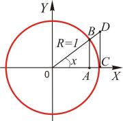 Рассмотрим рис. 73. Дан острый угол x. Выполним построения: проведем окружность с радиусом 1 с центром в вершине угла и введем обозначения, как указано на рисунке.