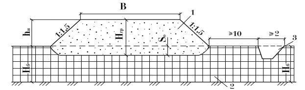 1 – минеральный грунт; 2 – торфяная залежь; 3 – торфоприемник глубиной до 1 м; S0 – осадка насыпи
