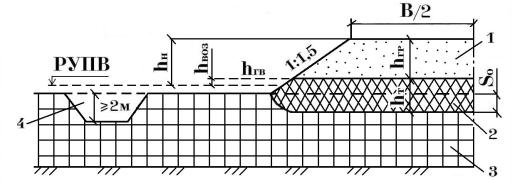 Величину hГP назначают не менее требуемого возвышения низа дорожной одежды от границы торфяной насыпи и принимают: