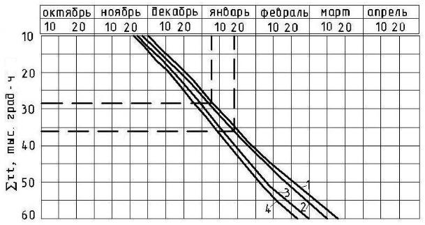 насыпи толщиной 0,4 м промерзнет к моменту, когда сумма температур в рассматриваемом районе составит ∑tτ = 28,5 + 7,5 = 36 тыс. град·ч, что произойдет 18 января, т.е. через 13 суток после начала промораживания слоя.