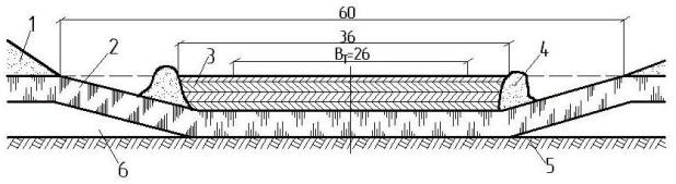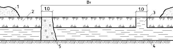1 – валы снега после расчистки дорожной полосы на ширину 60 м; 2 – ледяной покров; 3 – прорези во льду; 4 – вода; 5 – дамбочка из минерального грунта; ВТ – ширина подготавливаемой сухой траншеи, равная ширине насыпи понизу