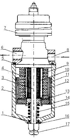 1 и 5 – прокладки; 2 – колпак; 3 – стяжной болт; 4 – фетровый и сетчатый фильтрующие элементы; 6 – резьбовое отверстие для штуцера выхода газа; 7 – электромагнитный клапан; 8 – резьбовое отверстие для штуцера входа газа; 9 – перфорированный каркас;10 – сетчатый фильтрующий элемент; 11 – нижний полюсной стакан; 12 – верхний полюсной стакан; 13 – опорная втулка; 14 – кольцевой постоянный магнит; 15 – пружина; 16 – прокладка; 17 – спускная пробка