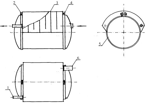 1 – патрубок отвода отработавших газов из контура; 2 и 4 – стяжные хомуты; 3 – контур утилизации отработавших газов двигателя; 5 – баллон СНГ; 6 – патрубок подвода отработавшихгазоввконтур