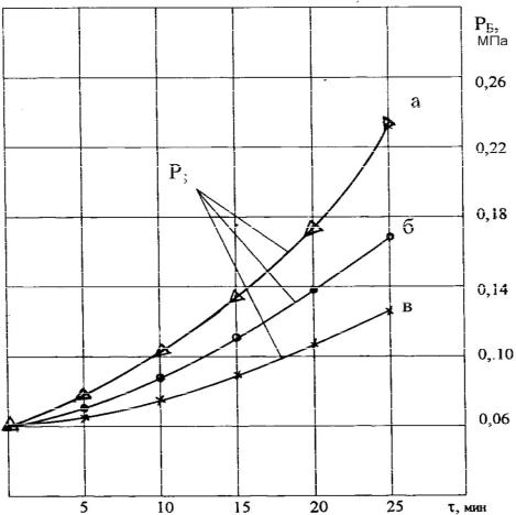 Рис.7.18.Изме-нение избыточного давления паровой фазы сжиженного нефтяного газа в газовом баллоне в процессе его подогрева теплотой отработавших газов двигателя ЗМЗ-53-07 при работе на бензине: