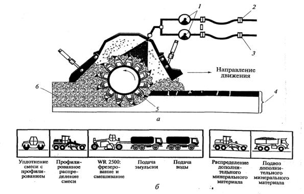 Рис. 37. Схема рабочего процесса (а) и комплекс машин с описанием основных операций (б) для холодного ресайклинга с применением битумной эмульсии: 1 – управляемые микропроцессором насосы; 2 – штуцер для подключения к цистерне с эмульсией; 3 – штуцер для подключения к цистерне с водой; 4 – поврежденный асфальтобетонный слой и нестабилизированное основание;