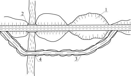 1 – реконструируемая выемка; 2 – насыпь; 3 – объездная дорога; 4 – временный низководный мост