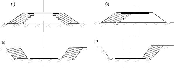 Рис. 2. Схемы уширения земляного полотна: а, б – двухстороннее и одностороннее в насыпях; в, г – двухстороннее и одностороннее в выемке