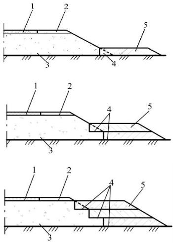 3 – существующее земляное полотно; 4 – уступы; 5 – слои отсыпаемого грунта