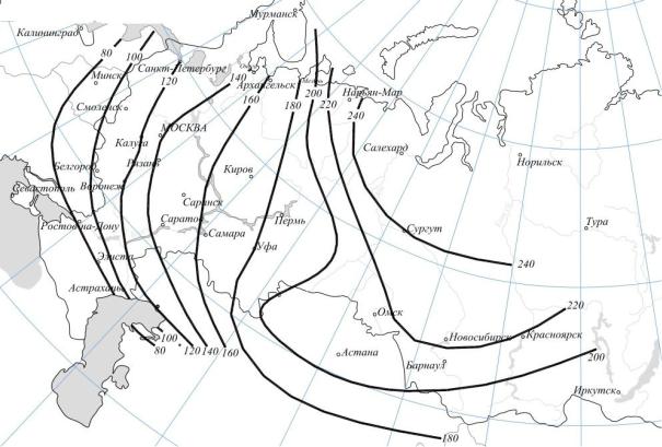 Рис. 9.4. Карта изолиний средней глубины промерзанияИZпр.ср. грунтов