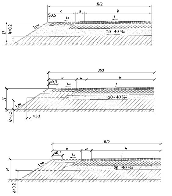 б– устройство дренирующего слоя на ширину проезжей части и краевых полос с отводом воды с помощью дренажных труб; в – устройство дренирующего слоя на ширину проезжей части и краевых полос