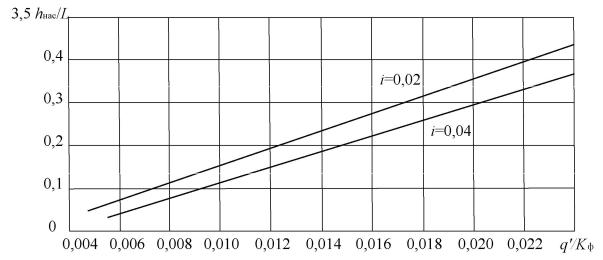 i1 и i2 – продольные уклоны выше и ниже перелома продольного профиля; Кф – коэффициент фильтрации, м/сут; n – коэффициент пористости дренирующего слоя в долях единицы