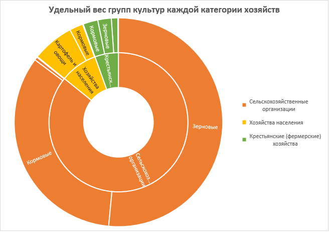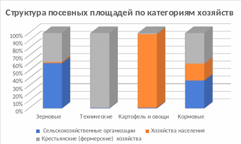 Сделаем вывод: как видно из таблицы и графика, преобладающая часть посевов (более 8/10) сосредоточена в сельскохозяйственных организациях, за исключением картофеля и овощей, свыше 90 % которых приходится на хозяйства населения, а также технических культур, более 90 % которых находятся в крестьянских хозяйствах.