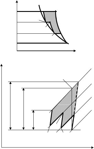 Многоступенчатое сжатие с промежуточным охлаждением между ступенями «приближает» рабочий процесс к изотермическому. Рассмотрим процесс трехступенчатого сжатия газа с промежуточным охлаждением (рис. 36). Если компрессор сжимает газ от давления р1 до давления р4 в одной ступени, то диаграмма такого адиабатного сжатия характеризуется линией 1-4-4”-1’-1. Пусть в первой ступени газ сжимается по адиабате от р1 до р2 (процесс 1-2). При охлаждении газа в холодильнике температура его уменьшается, точка 2 переместится на исходную изотерму (точка 2’). Сжатие газа во второй ступени происходит по адиабате 2’-3 от р2 до р3 . В холодильнике между второй и третьей ступенями газ охлаждается до начальной температуры (линия 3-3’) и выталкивается в третью ступень, где происходит аналогичное адиабатное сжатие от р3 до р4 (линия 3’-4’). Диаграмма такого трехступенчатого сжатия определяется фигурой, ограниченной линиями 1-2-2’-3-3’-4’-4”-1’-1. Сравнивая диаграммы одноступенчатого и трехступенчатого сжатия, можно отметить, что уменьшение работы сжатия в последнем случае характеризуется заштрихованной площадью.
