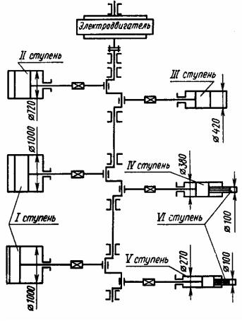 На рис. 40 приведена схема компрессора для подачи реакционной смеси в колонну синтеза аммиака. Подача компрессора 1800 м3/ч, конечное давление 32 МПа. Компрессор имеет шесть ступеней сжатия. Диаметр цилиндров первой ступени 1000 мм.