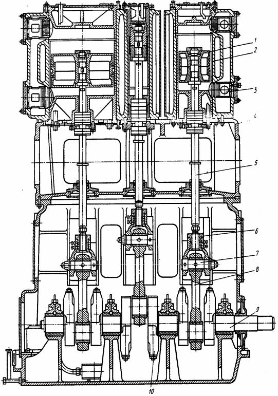 Рис. 41. Вертикальный трехступенчатый компрессор без смазывания цилиндров: 1 – поршень; 2 – цилиндр; 3 – клапан; 4 – фонарь; 5 – шток; 6 – ползун; 7 – палец; 8 – шатун; 9 – коленчатый вал; 10 – противовес