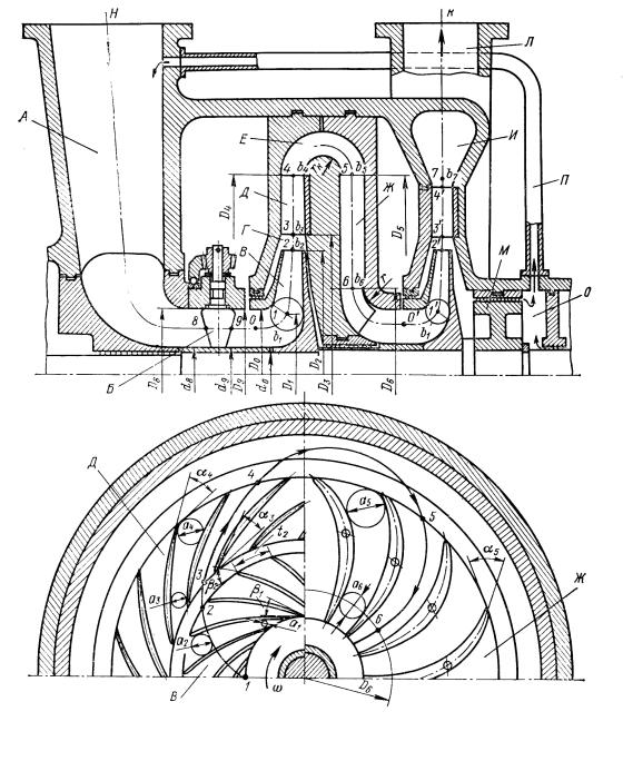 После диффузора газ проходит радиально-кольцевой поворот Е и поступает на лопатки обратно-направляющего аппарата (ОНА) Ж. В ОНА закрученный поток, вышедший из ЛД, раскручивается и с помощью лопаток, имеющих расположенные по радиусу выходные кромки, подается на вход в колесо второй ступени.