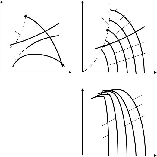 Характеристики центробежных компрессоров. Характеристикой компрессора динамического действия называется зависимость его основных рабочих параметров (таких, как отношение давлений= рК / рН , внутренняя мощность Ni , политропный (или изоэнтропный) КПД ПОЛ (или S) от параметра, характеризующего производительность компрессора (массовая или объемная производительность) при постоянной (рис. 51, а) или различных фиксированных значениях частоты вращения n (рис. 51, б).