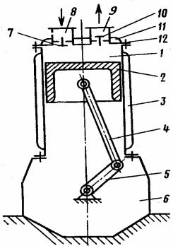 Рис. 26. Схема вертикального одноступенчатого компрессора простого действия: 1 – цилиндр; 2 – поршень; 3 – водяная рубашка для охлаждения цилиндра; 4 – шатун; 5 – кривошип коленчатого вала; 6 – станина-картер; 7 – всасывающий клапан; 8 – всасывающий патрубок; 9 – нагнетательный патрубок; 10 – нагнетательный клапан; 11 – водяная рубашка для охлаждения крышки цилиндра