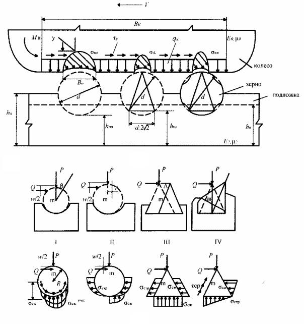 Рис. 4.1. Схемы к расчету потери устойчивости зерен поверхностной обработки: а – схема нагружения зерен усилиями от колесной нагрузки и формы потери устойчивости зерна-шара и зерна-пирамиды; б – расчетные схемы действия усилий и напряжений на зерне