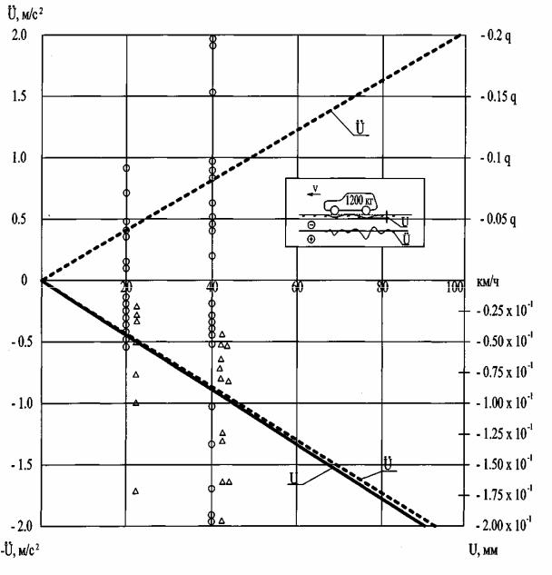 Рис. 8.15. Зависимость прогиба u и ускорений ü колебаний дорожной конструкции от скорости движения легкового автомобиля: