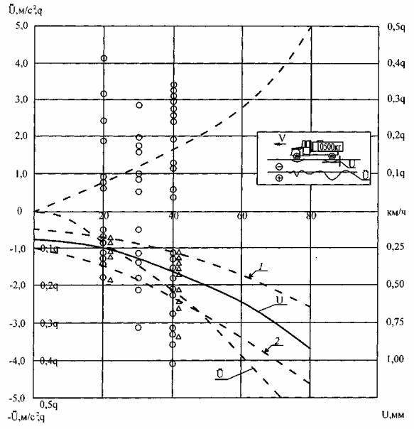 Рис. 8.16. Зависимость прогиба u и ускорений ü колебаний дорожной конструкции от скорости движения грузового автомобиля: 1 – минимальный предел адекватности; 2 – максимальный предел адекватности;