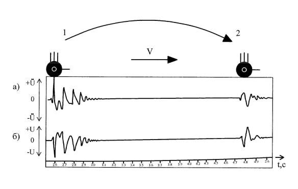 Запись колебания аэродромной конструкции производилась виброизмерительным оборудованием, состоящим из датчика типа К001, регистрирующего скорость колебания конструкции, и записывающего устройства (ноутбука). Датчик был установлен в зоне посадки ВС в верхнем слое покрытия на глубине 0,5h по траектории движения основной опоры (эксперимент проведен инж. В.М. Петровым). Конструкция ВПП в зоне посадке ВС была следующая: подстилающий слой основания – песок гравелистый толщиной 0,35÷0,50 м, основание – цементобетон В25 толщиной 0,24 м, нижний слой покрытия – армобетон В25 толщиной 0,16 м и верхний слой покрытия – армобетон В30 толщиной 0,20÷0,27 м.
