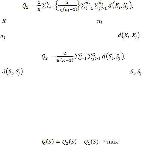 При решении задачи классификации функционал Q1 нужно минимизировать, т.е. стремиться к максимальному сходству ОТЕ в пределах одного класса, а Q2 наоборот максимизировать, т.е. добиваться максимального различия классов между собой.