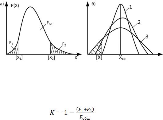 где K − уровень допустимых значений параметра, обеспечивающий качество конструктивных решений; F1, F2 – площади фигуры, соответствующие дефектным значениям; Fобщ – общая площадь фигуры, расположенная между кривой распределения и осью абсцисс.
