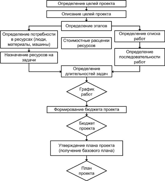 Рис. 4.8. Принципиальная схема разработки календарного плана в программе Microsoft Project 2010