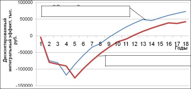 Рис. 4.12. Интегральный дисконтированный эффект по двум вариантам